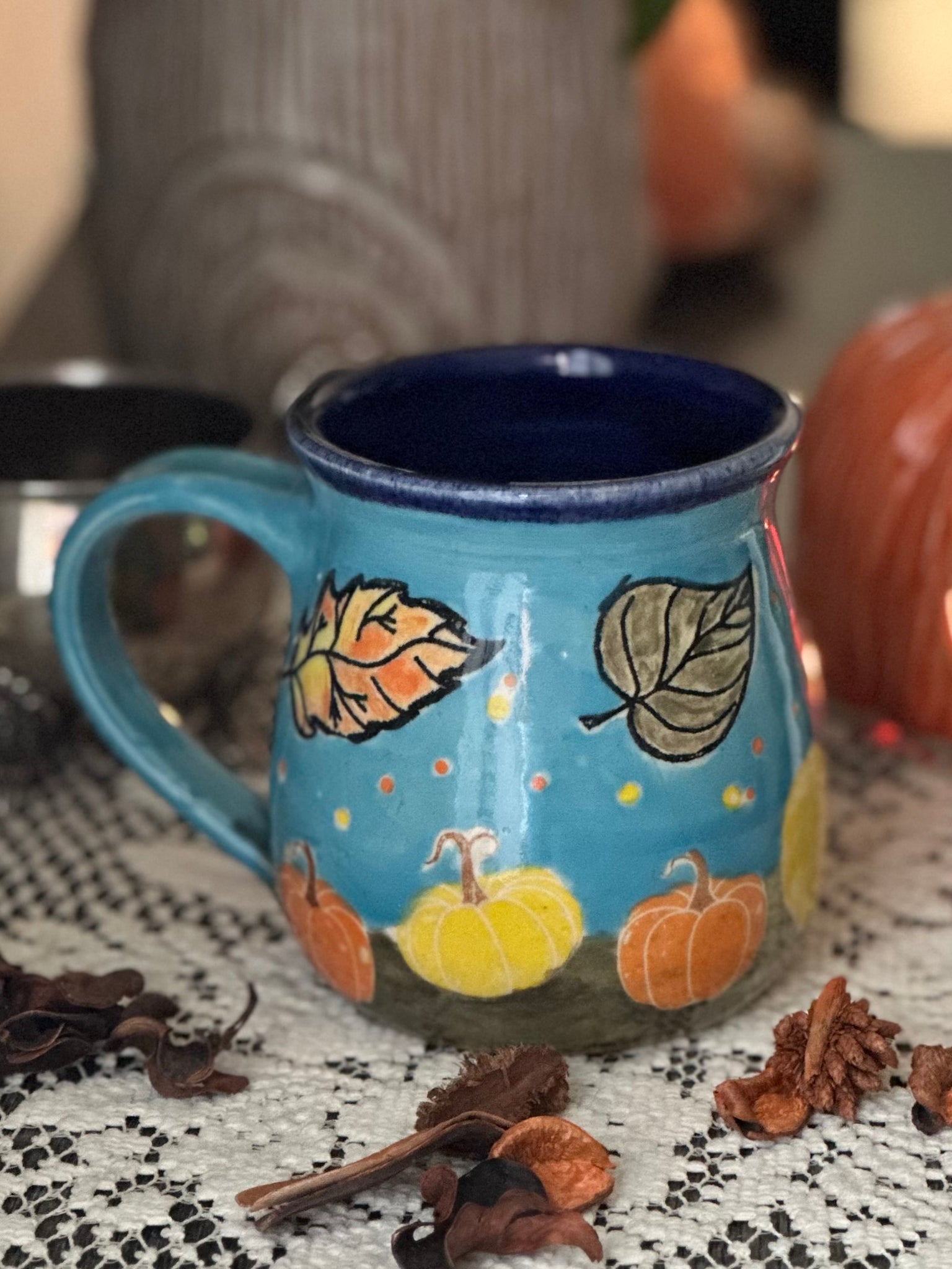 Celebrate the vibrant colors of fall with this handcrafted mug, featuring a whimsical scene of autumn leaves and plump pumpkins set against a bright teal sky. Each detail captures the essence of the season—the golden and red leaves, the rich orange pumpkins, and that unmistakable crispness of fall air. The bright teal glaze brings a playful pop that mirrors a sunny fall sky, making every sip a little moment of autumn joy. Perfect for cozying up with your favorite fall drinks, this unique piece is a must-have for savoring the magic of the season.