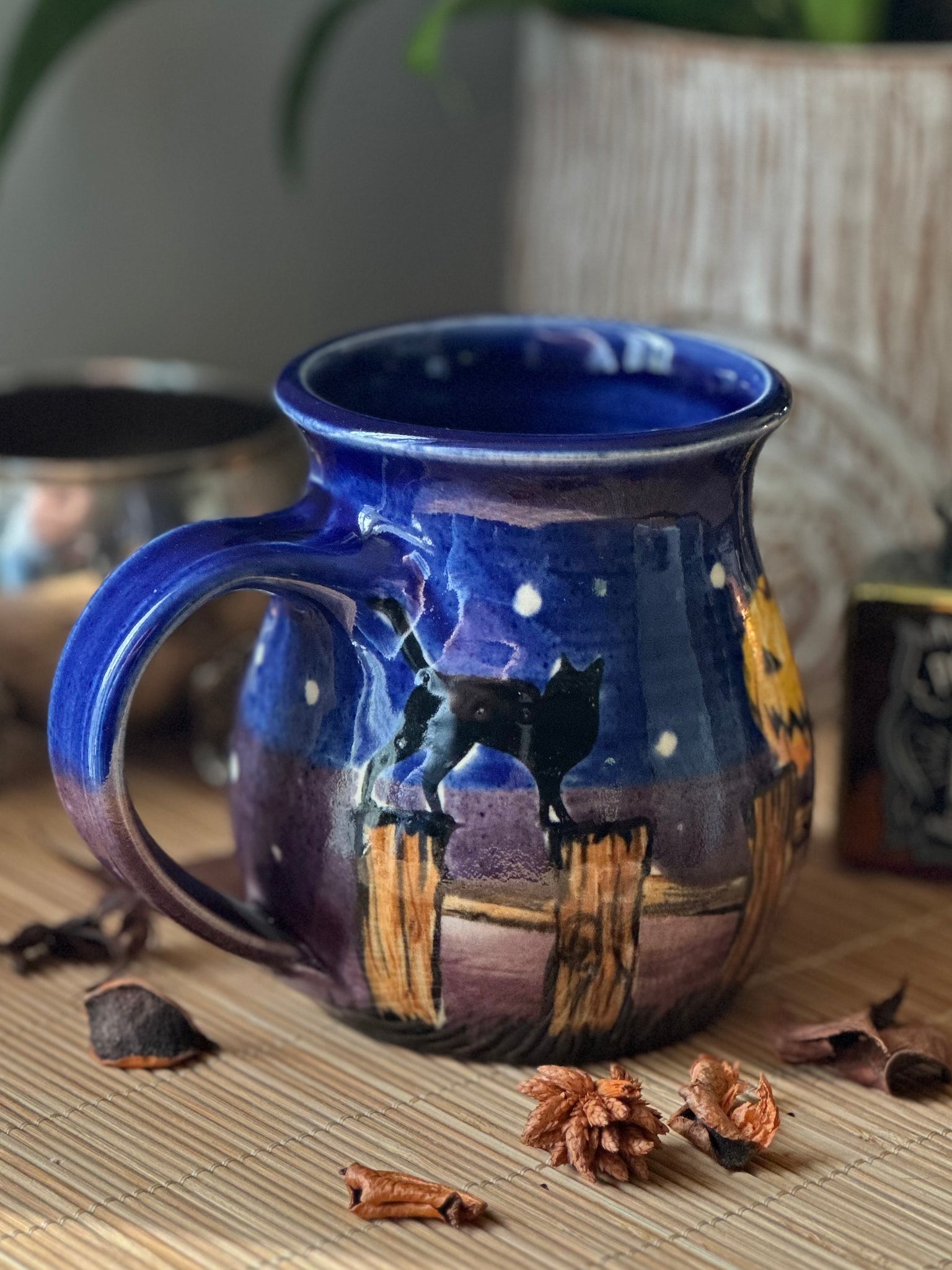 I'm absolutely thrilled with how the final piece turned out—it makes my five-year-old self so excited! From the hand-painted fence to the detailed transfers, I truly love every bit of these illustrations, and I hope you do too. They remind me so much of Five Little Pumpkins illustrated by Marybeth Butler, one of my favorite childhood books. This mug features three pumpkins, each with a unique expression, and two black cats—because what’s Halloween without our favorite spooky felines?