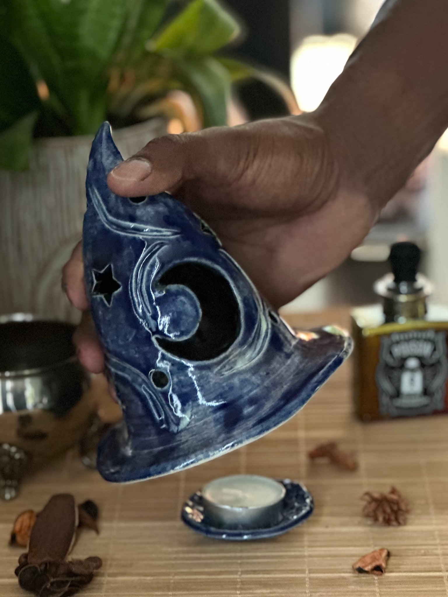 Add a touch of magical glow to your space with this handmade witch hat luminary! Shaped like a whimsical pointed hat, it features cut-out moons and stars that let candlelight sparkle through, casting an enchanting pattern across the room. Each luminary comes with a matching saucer to hold your candle securely, making it both decorative and functional. Perfect for setting the mood at spooky gatherings or adding a dash of witchy charm to your autumn décor.