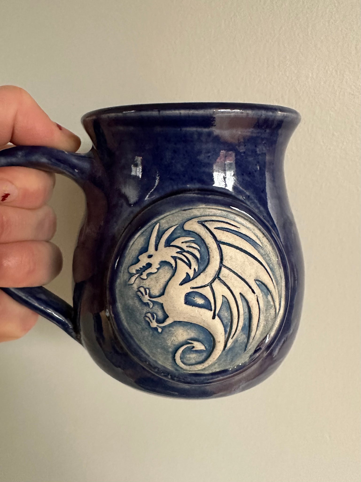 Unleash a touch of magic with this handcrafted dragon mug, glazed in a rich, deep sapphire blue that captures light like a gemstone. At its center, a beautifully carved dragon medallion rises from the surface—etched in soft, contrasting tones that highlight every scale, wing, and curl of its fierce silhouette.